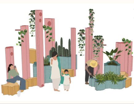Focusing on the theme of healing and unity, a series of planters, greenhouses and columns will mimic the form of the regions from pre-partition India, facilitating community growth and strengthening community ties.